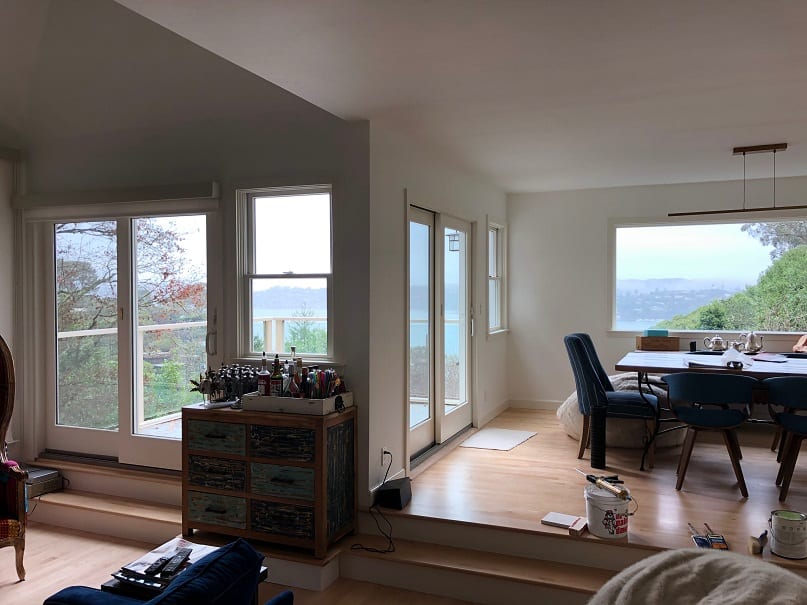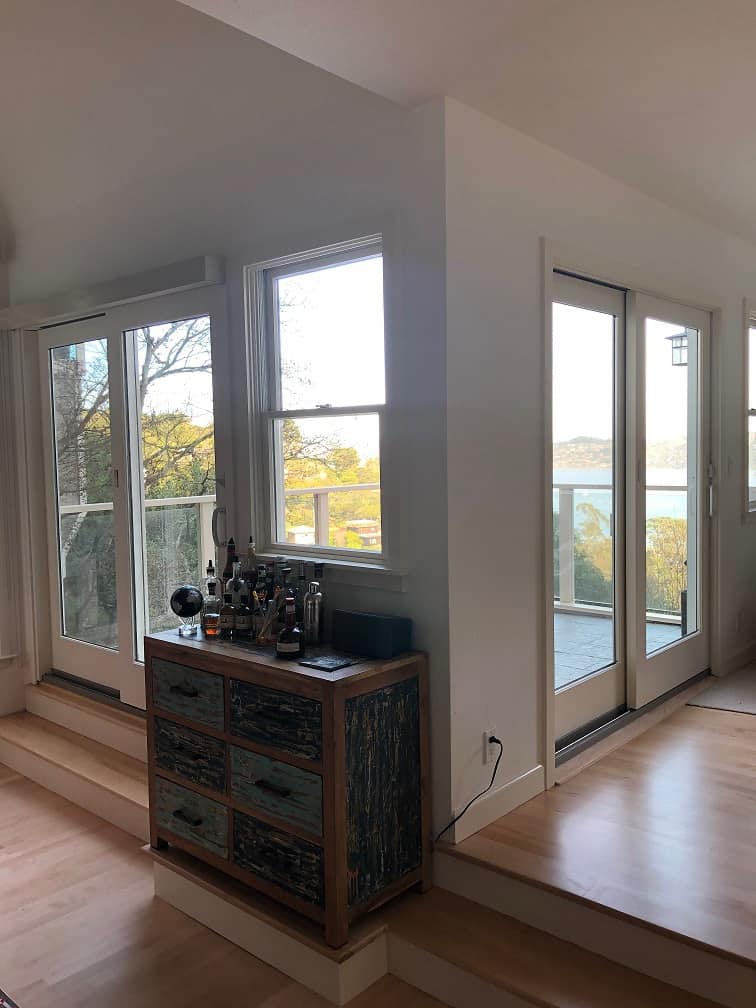 Sausalito Project where we added 2 large sliding glass doors, a custom shelving unit, and added new windows