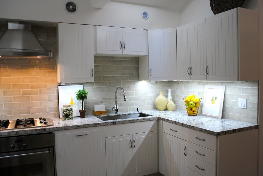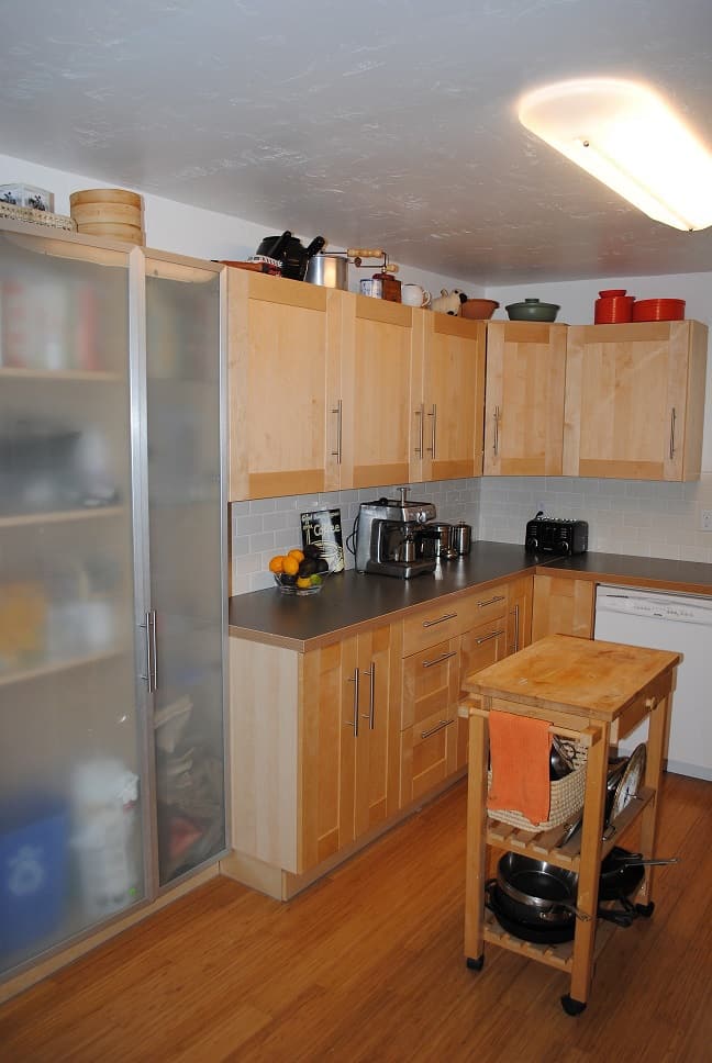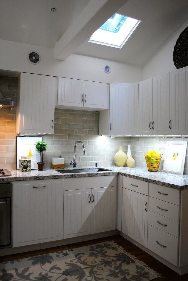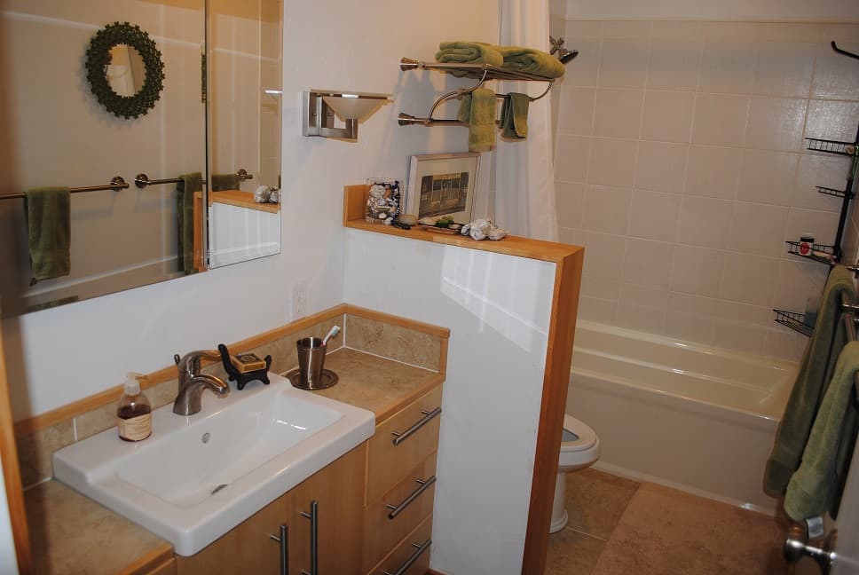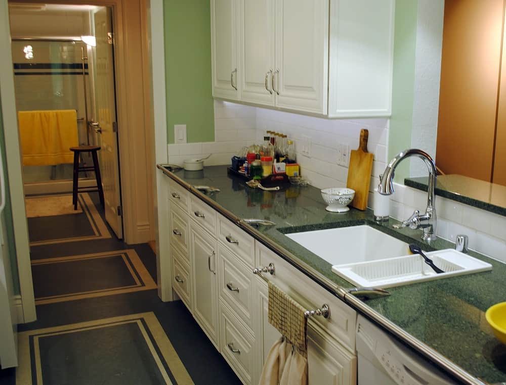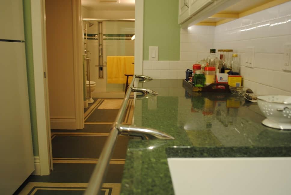 Bath and kitchen remodel in San Francisco for a client with limited mobility, see grab bars on kitchen counter
